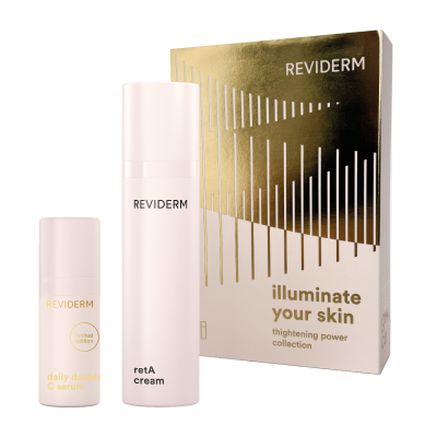Die tightening power collection enthält eine Miniatur des daily double C serum (20 ml) und eine Originalgröße der retA cream (50 ml). Das Serum enthält mikroverkapseltes Vitamin C, dass die die Kollagen-Synthese aktiviert und für strahlende Haut sorgt, während die ebenfalls mit Vitamin C angereichert, glättende 24-Stunden-Creme die hauteigenen Reparaturmechanismen ankurbelt und hilft Falten zu minimieren.